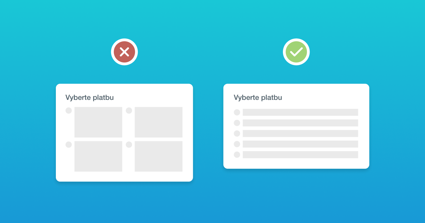 Platební a dopravní metody prezentujeme coby seznam s přepínačem (radio buttonem). Zákazník snáze pochopí, že je možné vybrat jen jednu volbu.